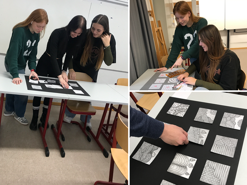 Die Schülerinnen und Schüler sollten eine Bildreihe erstellen mit mindestens 10 Bildern im Format 10 x 10 cm und dabei mit den Gestaltungselementen Punkt, Linie und/oder Fläche arbeiten. Auch die Formen Quadrat, Dreieck und Kreis waren hier besonders gefragt.